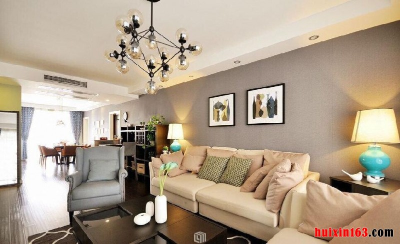 本套房屋装饰比较大气,没有多余繁杂的装饰却也并不失独特的味道,客厅中石膏板吊顶上的设计比较简洁,自后的边框出安装了一圈射灯,中间部分则悬挂了一盏个性十足的吊灯,别致的造型为客厅增添了一丝时尚的气息,电视背景墙的装饰也比较简洁,电视处做了凹槽的设计,并用吊顶上射灯的光束来突出设计感,暖黄色的光束也为客厅空间平添了一份温馨,与之相对的沙发背景墙则刷涂了灰色的墙壁漆,并在上面悬挂了两幅装饰画,素雅的色彩使其显得更加神秘,一款白色的布艺沙发靠墙而放,上面搭配了同一系列的抱枕做装饰同时也使沙发显得更加舒适,地面上一款黑色带有白色花纹的局部地毯,也是设计感十足,更加凸显了本套房屋装饰的主题。