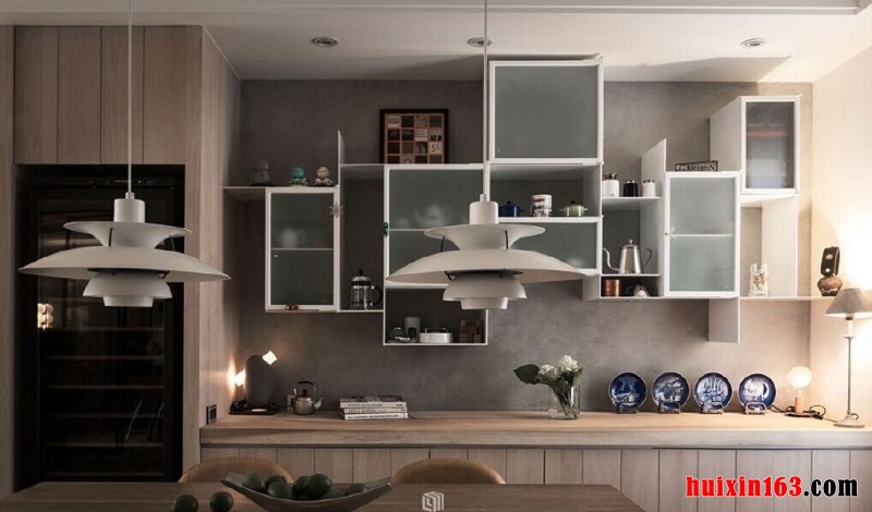 客厅中沙发背景墙的设计比较实用,同时也比较具有设计感,大小不一的格架没有规则的设计比较具有个性,业主可以摆放一些具有意义或是比较精致的装饰物品,这样不仅可以为客厅设计增添美感,也可以向来访者展现自己独特的品味及爱好,一款纯白色的布艺沙发质地柔软,上面搭配了多款蓝色的抱枕,更是将舒适彰显的更加彻底,电视背景墙上粘贴了带有竖条纹的壁纸做装饰,较暗的色彩搭配并没有为我们带来压抑感,反而是显得更加时尚,简洁却又具有个性,石膏板吊顶上做了圆形的造型设计,并在中间安装了几盏造型不一的吊灯,使其衬托的更加具有设计感,也比较符合本套房屋装饰的主题。