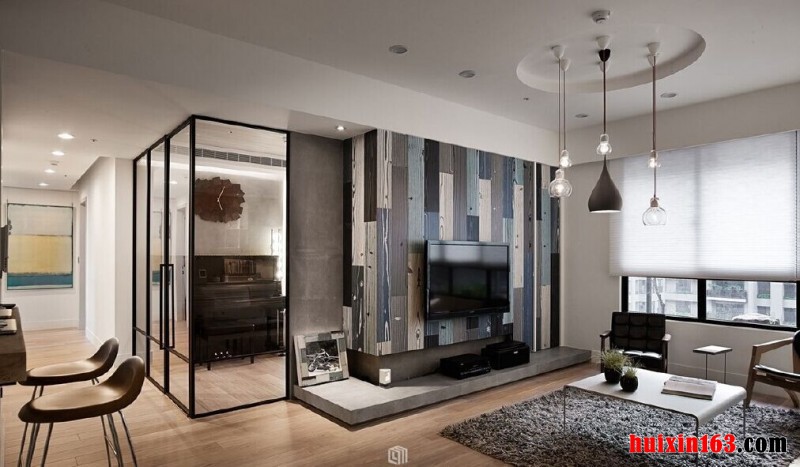 客厅中沙发背景墙的设计比较实用,同时也比较具有设计感,大小不一的格架没有规则的设计比较具有个性,业主可以摆放一些具有意义或是比较精致的装饰物品,这样不仅可以为客厅设计增添美感,也可以向来访者展现自己独特的品味及爱好,一款纯白色的布艺沙发质地柔软,上面搭配了多款蓝色的抱枕,更是将舒适彰显的更加彻底,电视背景墙上粘贴了带有竖条纹的壁纸做装饰,较暗的色彩搭配并没有为我们带来压抑感,反而是显得更加时尚,简洁却又具有个性,石膏板吊顶上做了圆形的造型设计,并在中间安装了几盏造型不一的吊灯,使其衬托的更加具有设计感,也比较符合本套房屋装饰的主题。