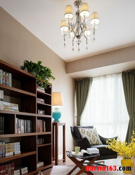 客厅中石膏板吊顶的装饰比较简洁,没有多余的装饰设计可以将中间的水晶吊灯衬托的更加精美,电视背景墙的设计也比较独特,简单却又具有个性,装饰木板带给人们更多的是一种自然的设计感,更贴近人们的生活,这样的设计似乎更能突显出现代风格装饰的特点,装饰木板两侧则安装了镜面装饰,在起到一定装饰效果的同时,使客厅空间显得更加通透、明亮,一款纯白色的布艺沙发靠墙而放,可以带给人们无限的舒适感,背景墙上则悬挂了两幅装饰画,素雅的色彩可以显得更加淡雅,落地窗前悬挂了双层窗帘,一层轻质的薄纱可以在白天为人们遮挡刺眼的阳光,而一层厚重的绿色布艺窗帘则可以在夜晚带给人们一种安全感,这样的色彩搭配也比较符合本套房屋的装饰风格。