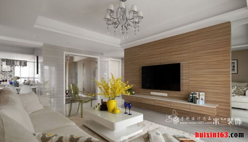 客厅中石膏板吊顶的装饰比较简洁,没有多余的装饰设计可以将中间的水晶吊灯衬托的更加精美,电视背景墙的设计也比较独特,简单却又具有个性,装饰木板带给人们更多的是一种自然的设计感,更贴近人们的生活,这样的设计似乎更能突显出现代风格装饰的特点,装饰木板两侧则安装了镜面装饰,在起到一定装饰效果的同时,使客厅空间显得更加通透、明亮,一款纯白色的布艺沙发靠墙而放,可以带给人们无限的舒适感,背景墙上则悬挂了两幅装饰画,素雅的色彩可以显得更加淡雅,落地窗前悬挂了双层窗帘,一层轻质的薄纱可以在白天为人们遮挡刺眼的阳光,而一层厚重的绿色布艺窗帘则可以在夜晚带给人们一种安全感,这样的色彩搭配也比较符合本套房屋的装饰风格。