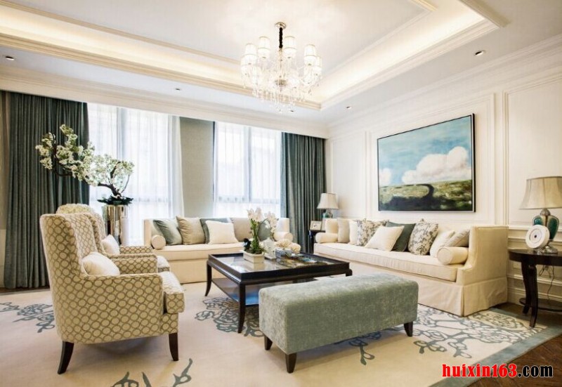 本套房屋装饰的主色彩是以白色为主,客厅中的石膏板吊顶上采用了平顶式的设计,并在中间悬挂了一盏华丽的水晶灯饰,水晶吊坠晶莹剔透,使客厅中的主要光源,但也是一件精美的工艺品,沙发背景墙上悬挂了一幅装饰画,色彩素雅的风景装饰画,只是看着就可以带给人们一个好心情,一款白色的布艺沙发上搭配了几款白底带有碎花图案的抱枕,不仅设计感极强,也可以带给人们一种舒适感,可以让人们忙碌一天后回到家中感到无比的轻松,客厅中间摆放了一款方形的茶几,木质的边框使其显得非常具有质感,搭配上房屋中其它的装饰则会显得更加典雅、高档,比较符合本套房屋装饰的主题。