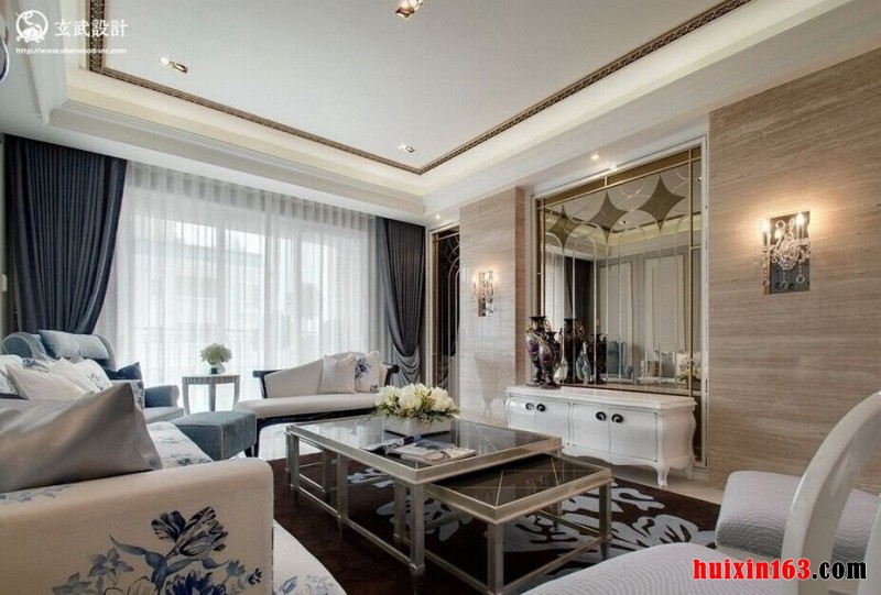 本套房屋装饰主要是以白色为主,客厅中的石膏板吊顶上么有多余的造型设计,只是在四周的圈边处做了简单的设计,是吊顶可以显得更加大气,沙发背景墙上的设计亦是如此,简洁却又不失风度,一款白底带有蓝色花纹图案的沙发靠墙而放,上面搭配了几款色彩不一的抱枕,为客厅空间提供了一个温馨的休息空间,同时这样素雅的设计业与本套房屋装饰相符,一款钢化玻璃材质的茶几摆放在客厅中间,时尚的造型更能突显出现代装饰的设计感,一款深棕色带有白色花纹的局部地毯装饰着客厅的地面,是装饰布局显得更加紧凑,从而带给人们一种温馨感,也是现代房屋装饰中不可缺少的一项元素。